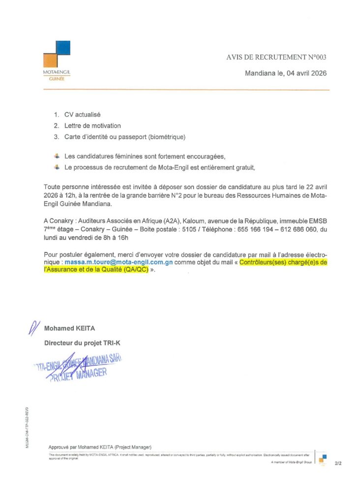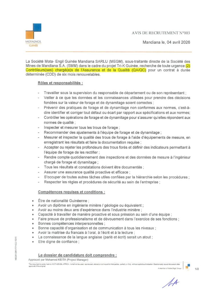 Avis de recrutement de (2) Contrôleurs(ses) chargé(e)s de l’Assurance et de la Qualité (QA/QC)