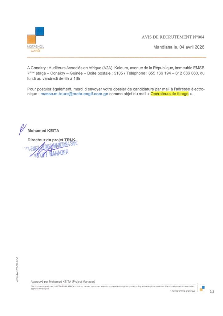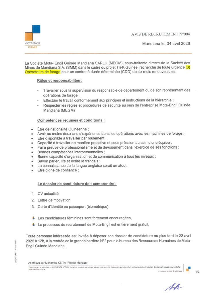 Avis de recrutement de (3)Opérateurs de forage