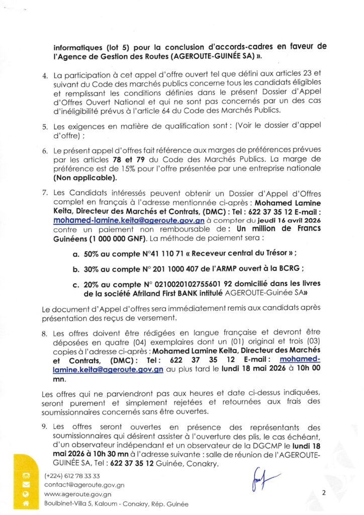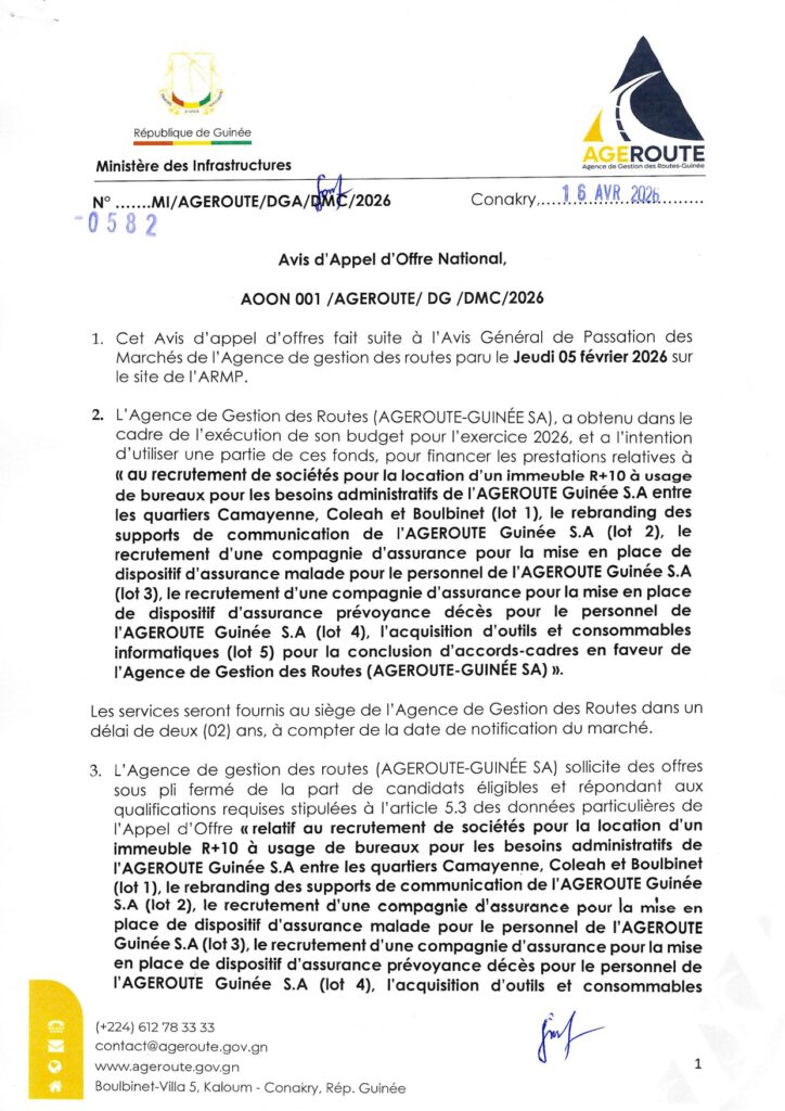 Avis de recrutement de sociétés pour la location d’un immeuble R+10 à usagede bureaux pour les besoins administratifs de l’AGEROUTE Guinée S.A entre les quartiers Camayenne, Coleah et Boulbinet (lot 1)…