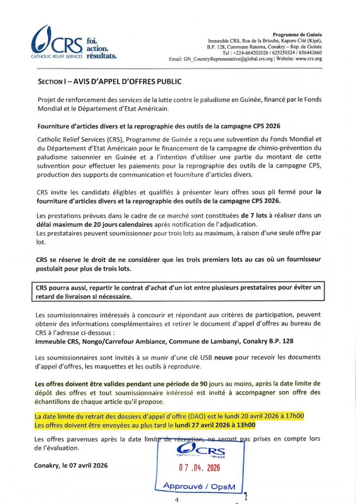 Avis d’appel d’offres pour la Fourniture d’articles divers et la reprographie des outils de la campagne CPS 2026