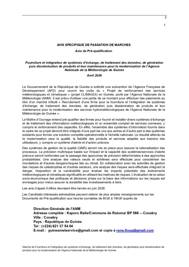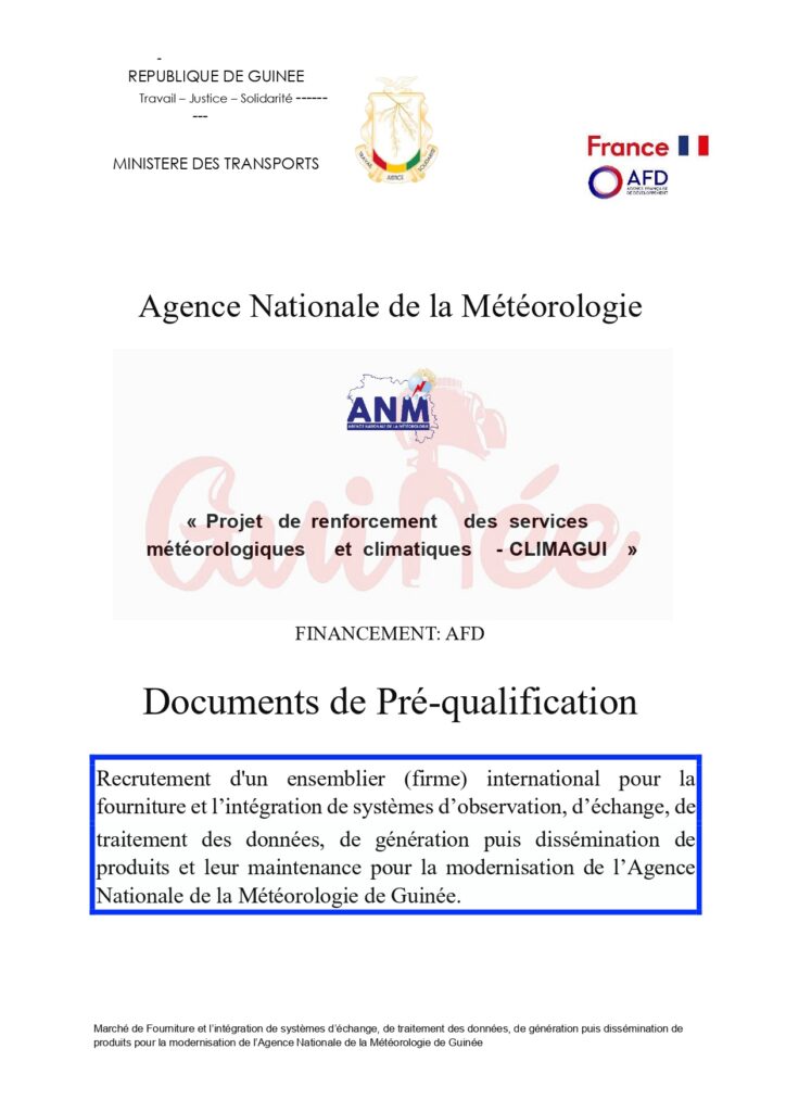 Recrutement d’un ensemblier (firme) international pour la fourniture et l’intégration de systèmes d’observation, d’échange, de traitement des données, de génération puis dissémination de produits et leur maintenance pour la modernisation de l’Agence Nationale de la Météorologie de Guinée.