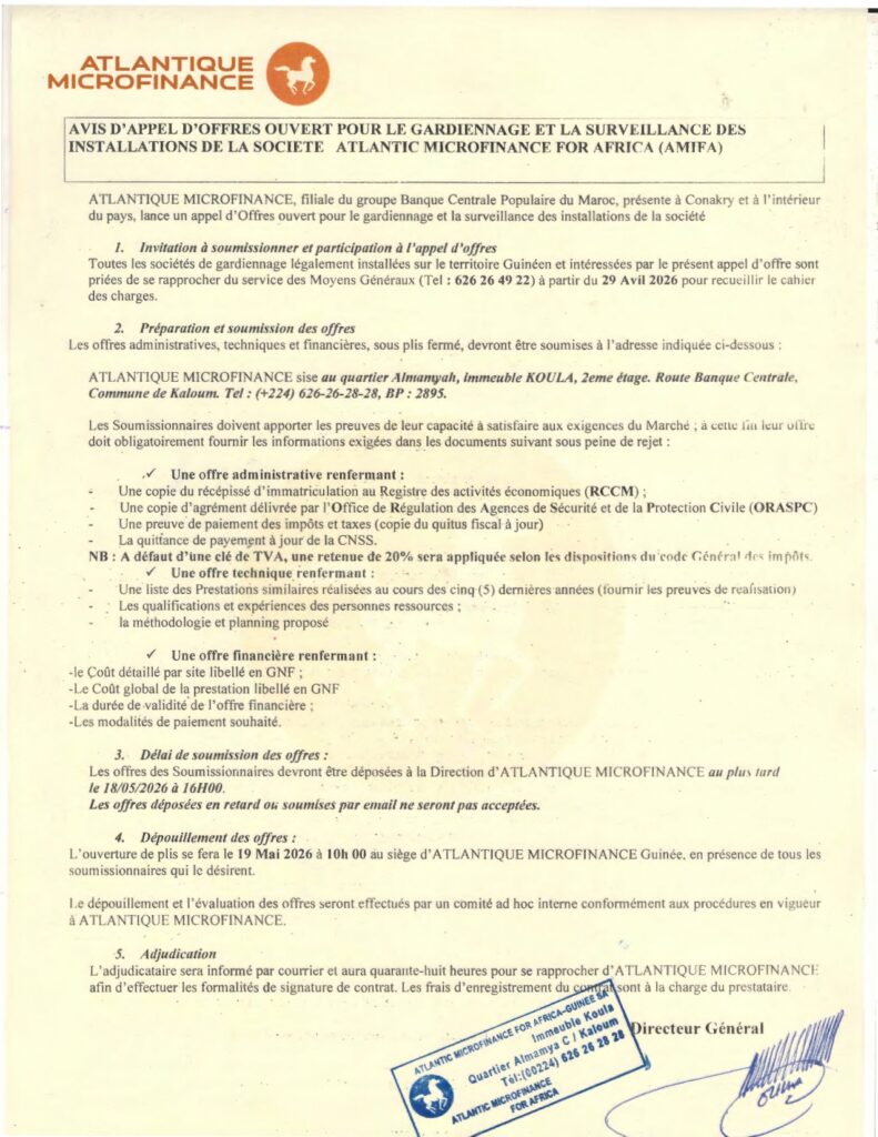 AVIS D’APPEL D’OFFRES OUVERT POUR LE GARDIENNAGE ET LA SURVEILLANCE DES INSTALLATIONS DE LA SOCIETE ATLANTIC MICROFINANCE FOR AFRICA (AMIFA)