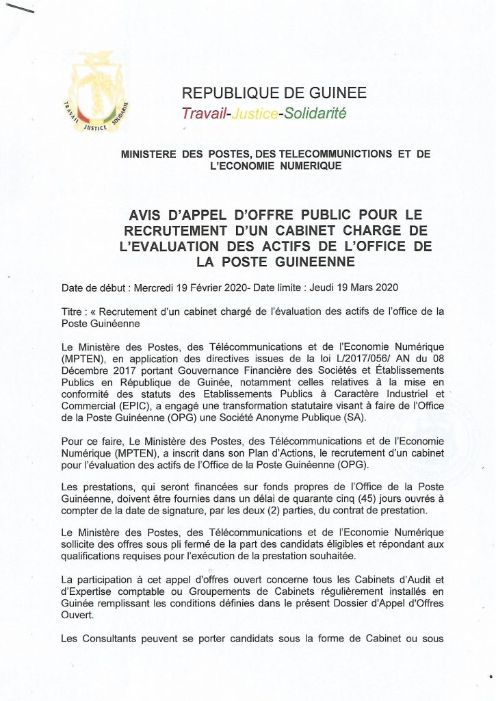 Appels d'offres Avis dâAppel dâOffres Publique pour le Recrutement dâUn Cabinet Chargé de lâévaluation des actifs de lâOffice de la poste Guinéenne Par Sékou Mohamed SAVANE - 19 février 2020 0 310 FacebookTwitterPinterestWhatsApp
