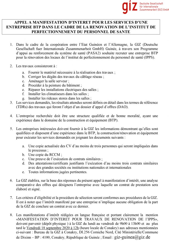 Appels d'offres APPEL A MANIFESTATION DâINTERET POUR LES SERVICES DâUNE ENTREPRISE BTP DANS LE CADRE DE LA RENOVATION DE LâINSTITUT DE PERFECTIONNEMENT DU PERSONNEL DE SANTE Par Sékou Mohamed SAVANE - 31 août 2020 0 110 FacebookTwitterPinterestWhatsApp
