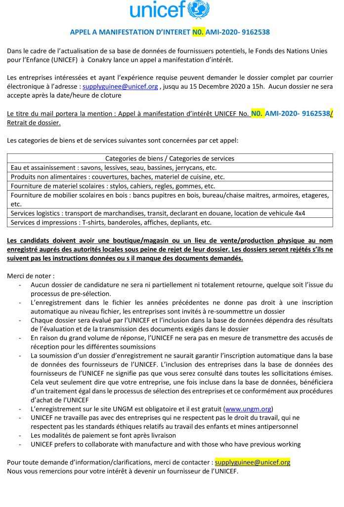 Appels d'offres APPEL A MANIFESTATION DâINTERET N0. AMI-2020-9162538 Par Sékou Mohamed SAVANE - 27 octobre 2020 0 265 FacebookTwitterPinterestWhatsApp