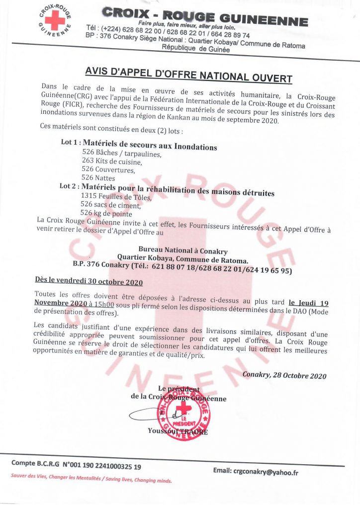 Appels d'offres AVIS D’APPEL D’OFFRE NATIONAL OUVERT Par Sékou Mohamed SAVANE - 30 octobre 2020 0 329 FacebookTwitterPinterestWhatsApp