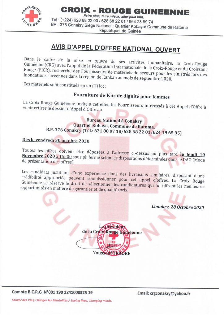 Appels d'offres AVIS D’APPEL D’OFFRE NATIONAL OUVERT POUR LA FOURNITURE DE KIT DE ….. Par Sékou Mohamed SAVANE - 30 octobre 2020 0 289 FacebookTwitterPinterestWhatsApp