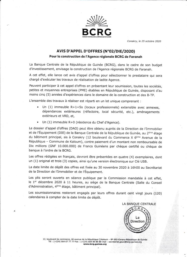 Appels d'offres AVIS D’APPEL D’OFFRES (N 02/DIE/2020) POUR LA CONSTRUCTION DE L’AGENCE DE LA BCRG DE FARANAH Par Sékou Mohamed SAVANE - 4 novembre 2020 0 1417 FacebookTwitterPinterestWhatsApp