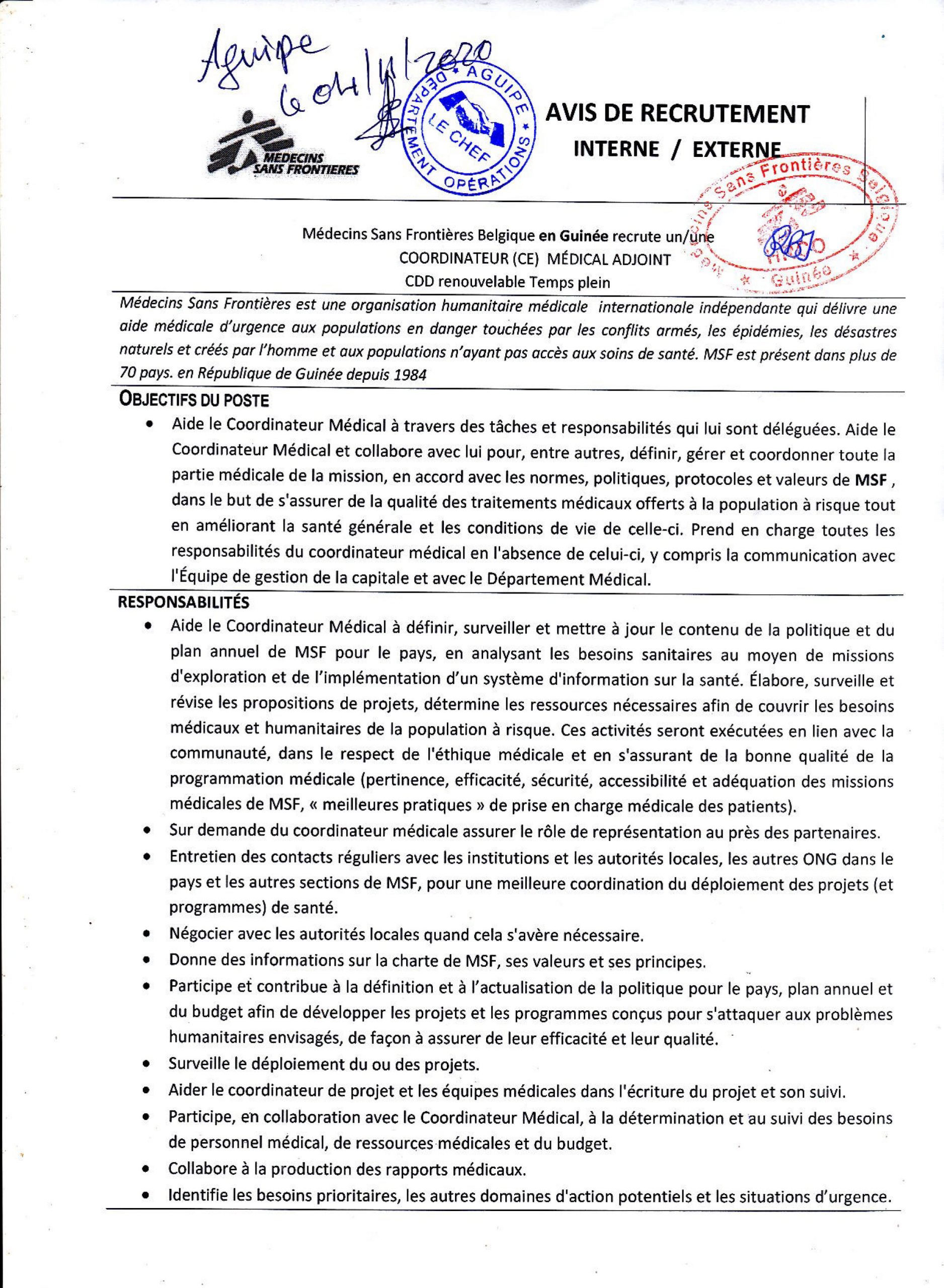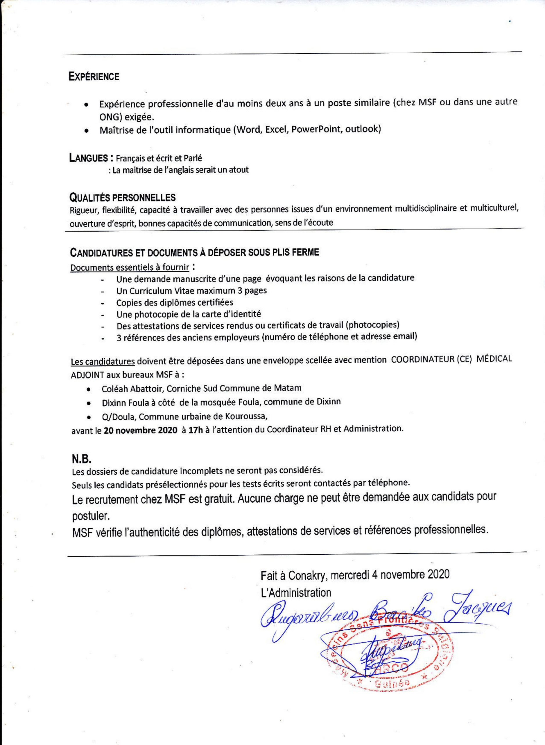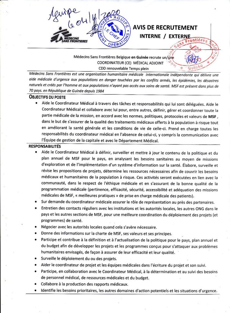 Opportunités d'emplois AVIS DE RECRUTEMENT INTERNE/EXTERNE POUR LE RECRUTEMENT D’UN(E) COORDINATEUR (TRICE) MEDICAL ADJOINT Par Sékou Mohamed SAVANE - 4 novembre 2020 0 12593 FacebookTwitterPinterestWhatsApp