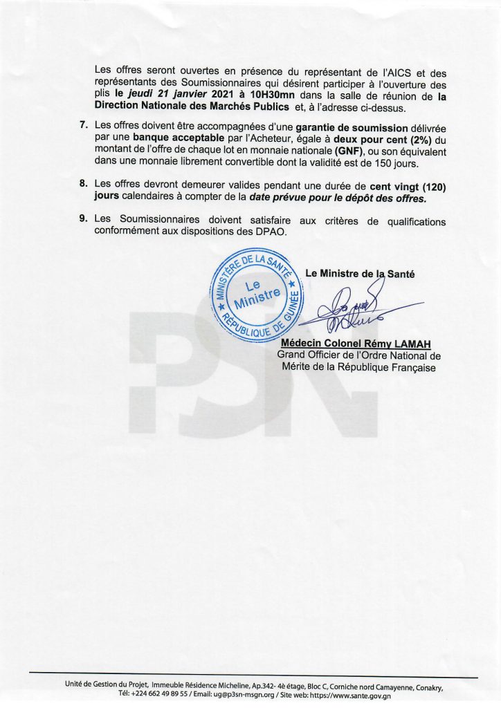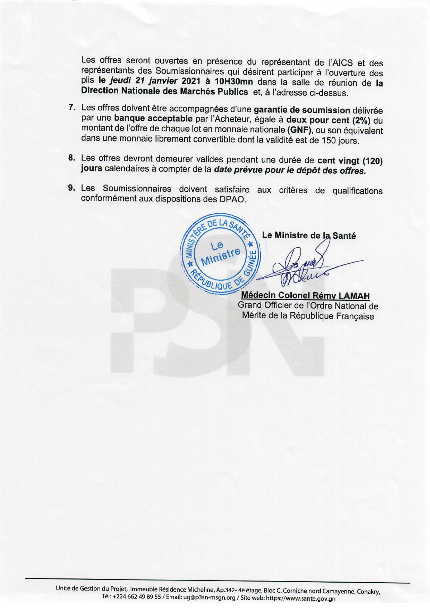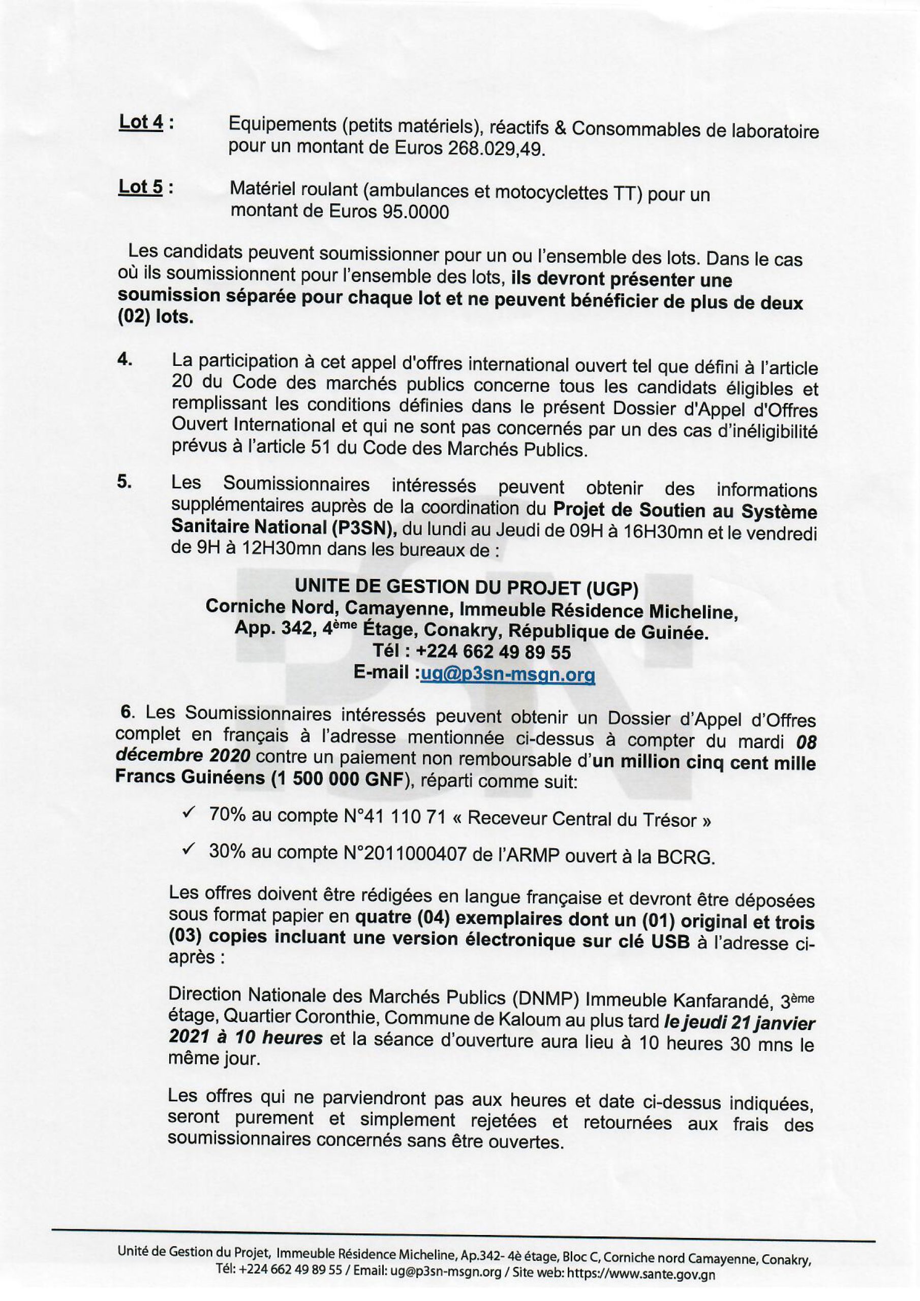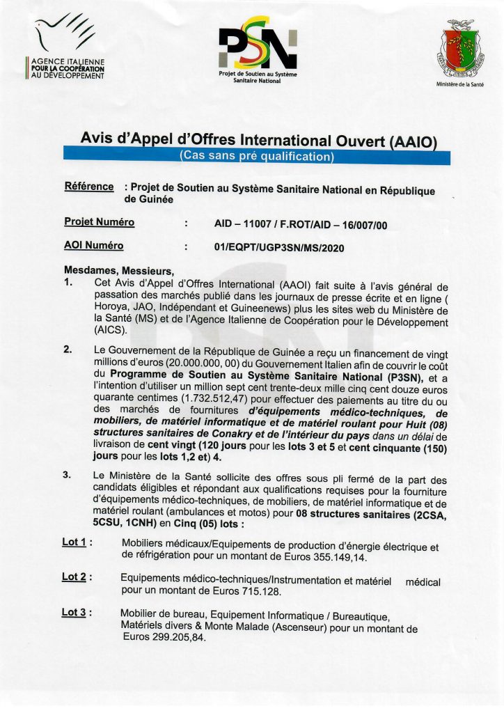 Appels d'offres Le Projet de soutien au système national sanitaire lance un Avis dâoffres international ouvert Par Sékou Mohamed SAVANE - 1 décembre 2020 0 366 FacebookTwitterPinterestWhatsApp