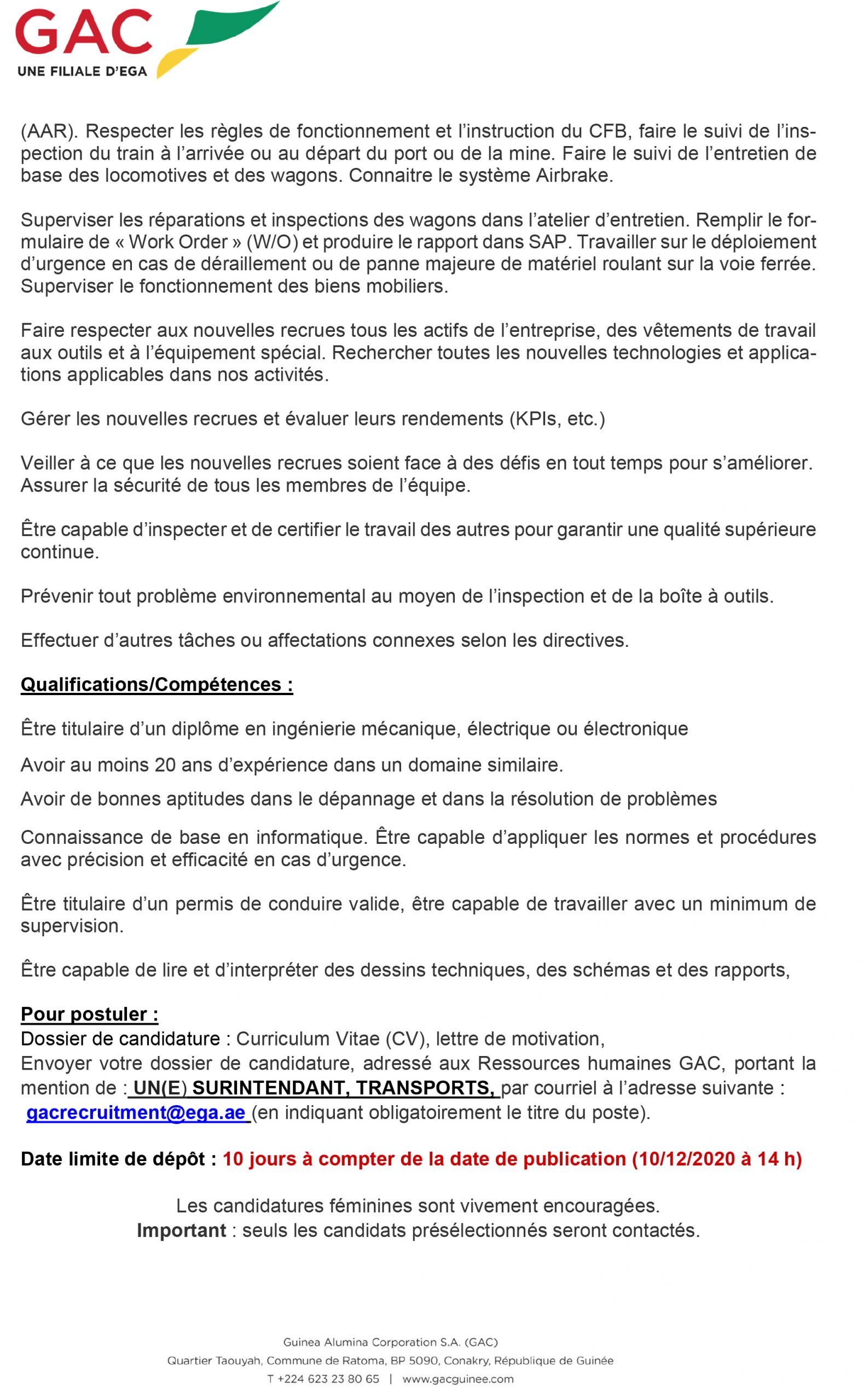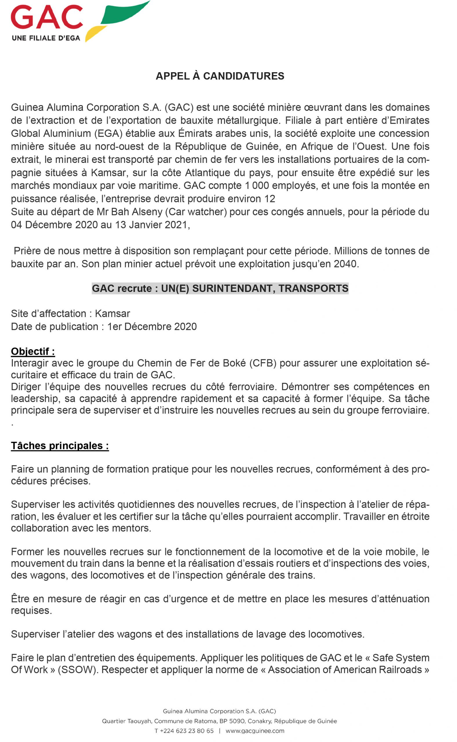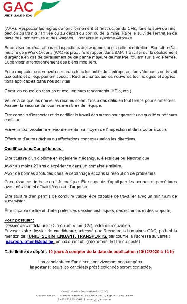 Opportunités d'emplois GAC recrute un surintendant, transports Par Sékou Mohamed SAVANE - 2 décembre 2020 0 638 FacebookTwitterPinterestWhatsApp