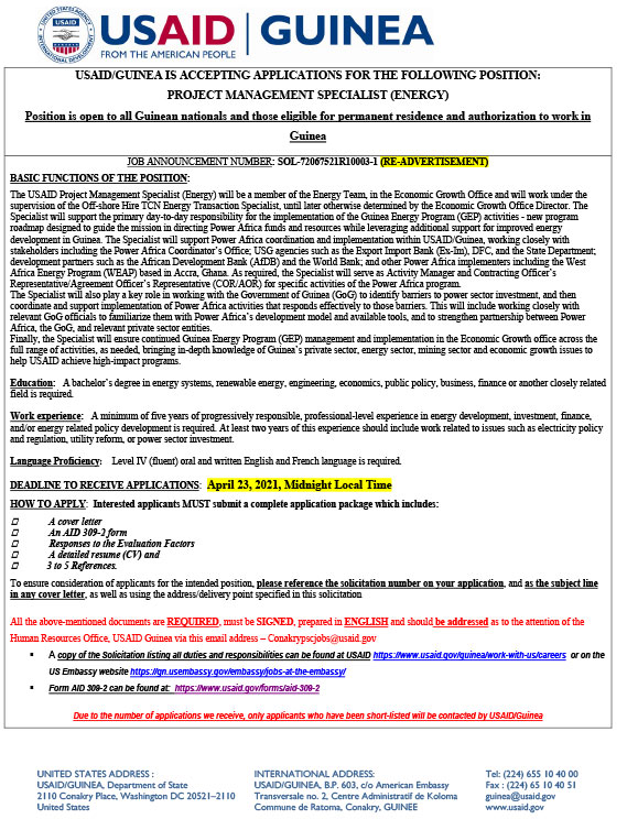 Opportunités d'emplois USAID/GUINEA IS ACCEPTING APPLICATIONS FOR THE FOLLOWING POSITION: PROJECT MANAGEMENT SPECIALIST (ENERGY) Par Sékou Mohamed SAVANE - 1 avril 2021 0 318 FacebookTwitterPinterestWhatsApp