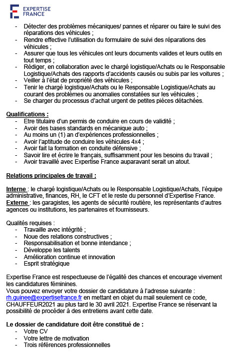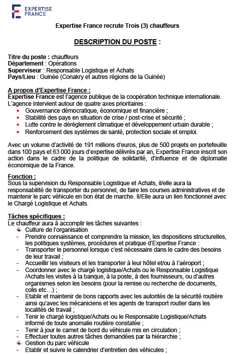 Opportunités d'emplois Expertise France recrute Trpois(3) chauffeurs Par Sékou Mohamed SAVANE - 19 avril 2021 0 557 FacebookTwitterPinterestWhatsApp