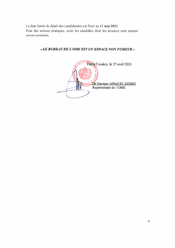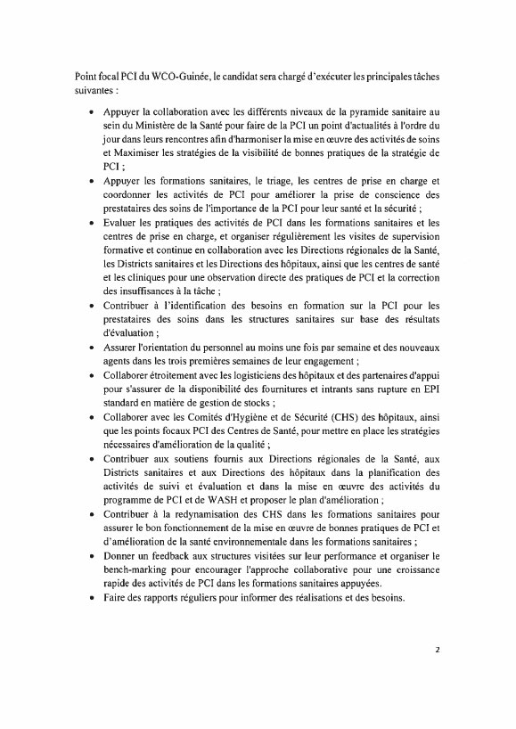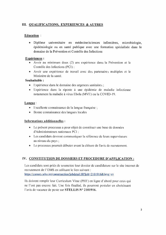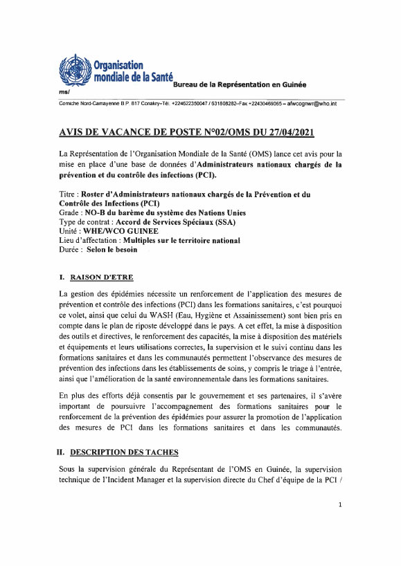Opportunités d'emplois Avis de Vacance de Poste pour la Mise en Place dâUne Base de donnée dâAdministrateurs nationaux chargés de la prévention et du contrôle des infections (PCI) Par Sékou Mohamed SAVANE - 29 avril 2021 0 953 FacebookTwitterPinterestWhatsApp