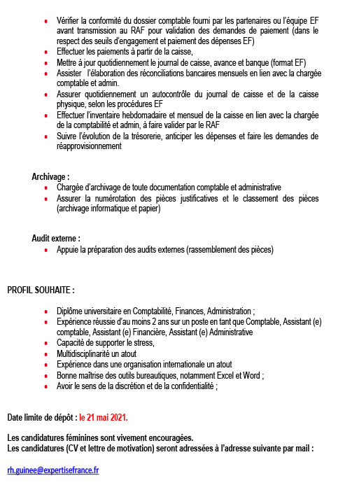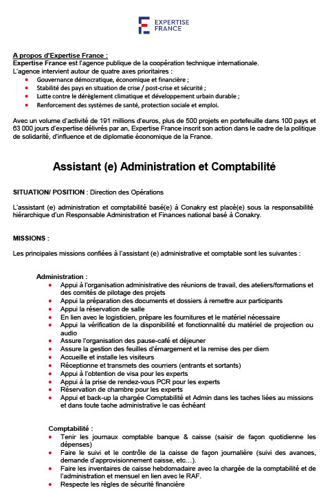 Opportunités d'emplois EXPERTISE FRANCE RECRUTE: ASSISTANT(E) ADMINISTRATION ET COMPTABILITE Par Sékou Mohamed SAVANE - 5 mai 2021 0 433 FacebookTwitterPinterestWhatsApp