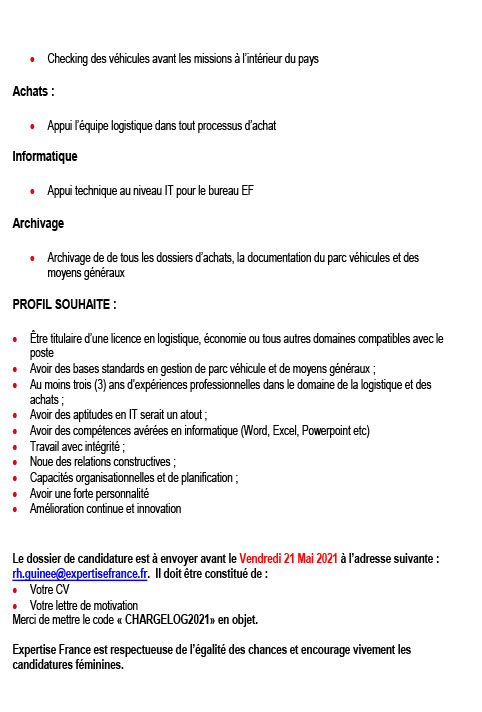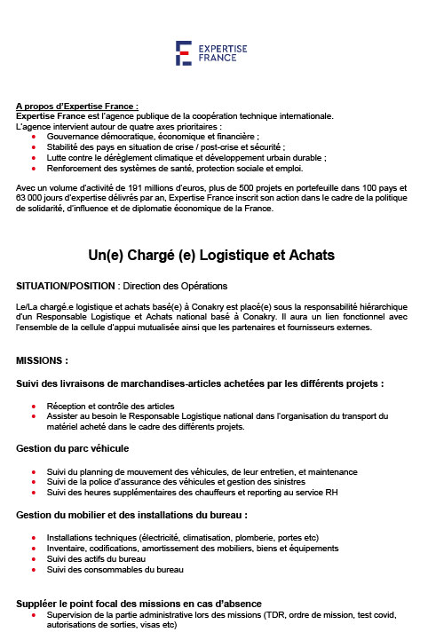 Opportunités d'emplois EXPERTISE FRANCE RECRUTE: UN(E) CHARGE(E) LOGISTIQUE ET ACHATS Par Sékou Mohamed SAVANE - 5 mai 2021 0 371 FacebookTwitterPinterestWhatsApp