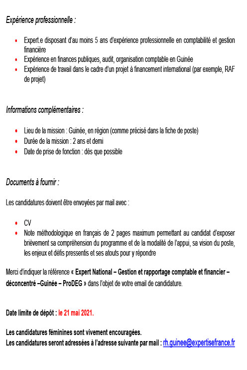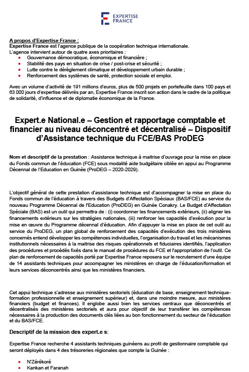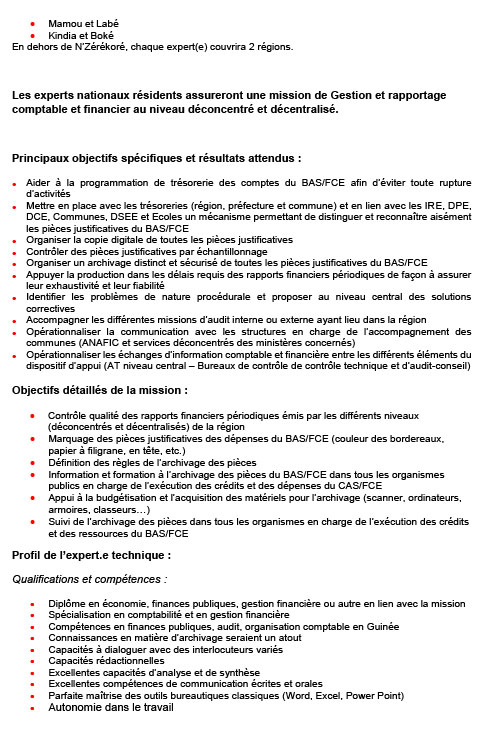 Opportunités d'emplois Expert.e National.e â Gestion et rapportage comptable et financier au niveau déconcentré et décentralisé â Dispositif dâAssistance technique du FCE/BAS ProDEG Par Sékou Mohamed SAVANE - 5 mai 2021 0 334 FacebookTwitterPinterestWhatsApp