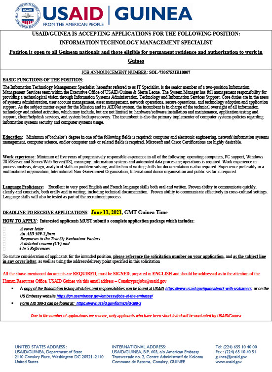 Opportunités d'emplois USAID/GUINEA IS ACCEPTING APPLICATIONS FOR THE FOLLOWING POSITION: INFORMATION TECHNOLOGY MANAGEMENT SPECIALIST Par Sékou Mohamed SAVANE - 12 mai 2021 0 810 FacebookTwitterPinterestWhatsApp