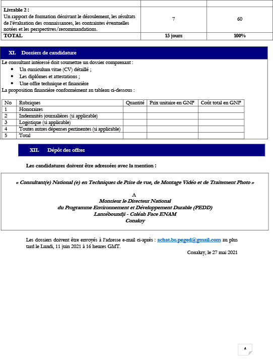 Appels d'offres Avis de Recrutement dâUn (e) Consultant (e) National (e) en Techniques de Prise de vue, de Montage Vidéo et de Traitement Photo Par Sékou Mohamed SAVANE - 31 mai 2021 0 325 FacebookTwitterPinterestWhatsApp