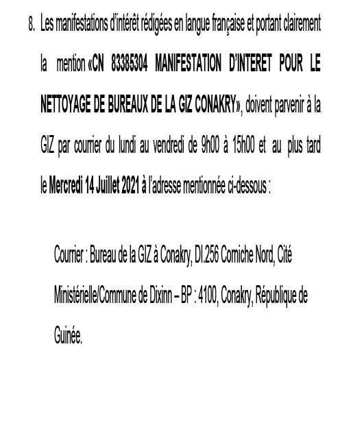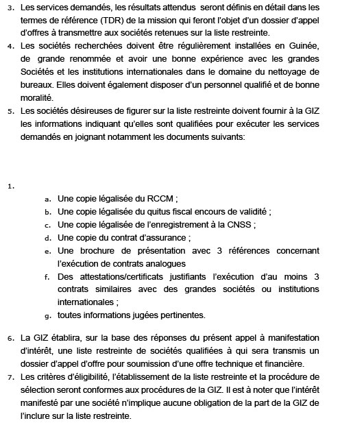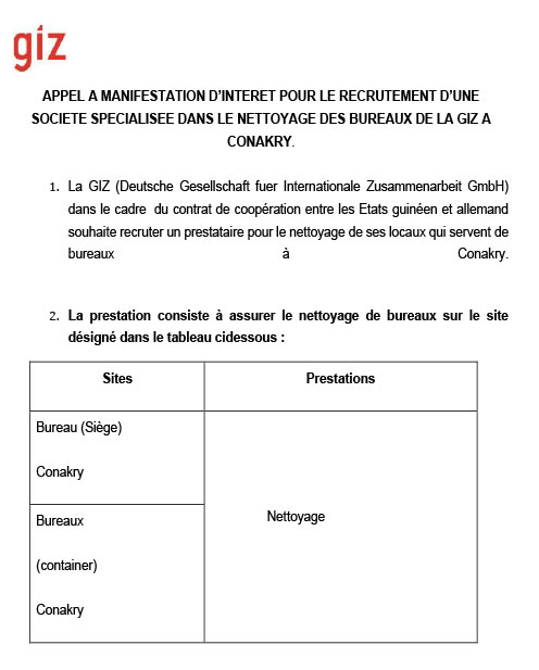 Appels d'offres APPEL A MANIFESTATION DâINTERET POUR LE RECRUTEMENT DâUNE SOCIETE SPECIALISEE DANS LE NETTOYAGE DES BUREAUX DE LA GIZ A CONAKRY Par Sékou Mohamed SAVANE - 5 juillet 2021 0 1549 FacebookTwitterPinterestWhatsApp