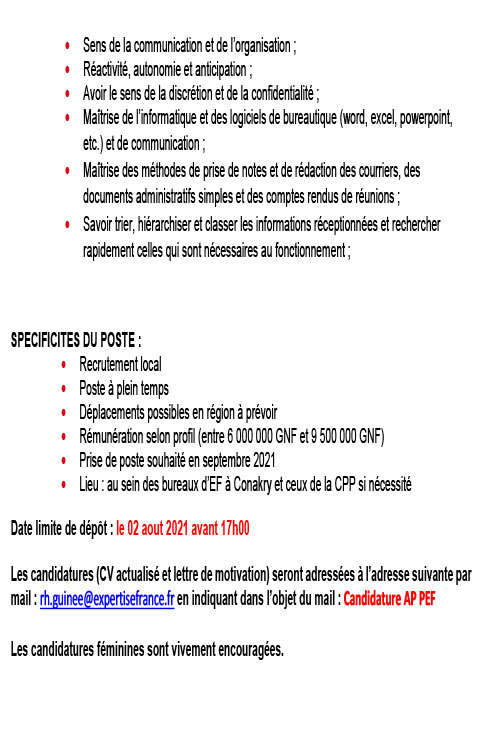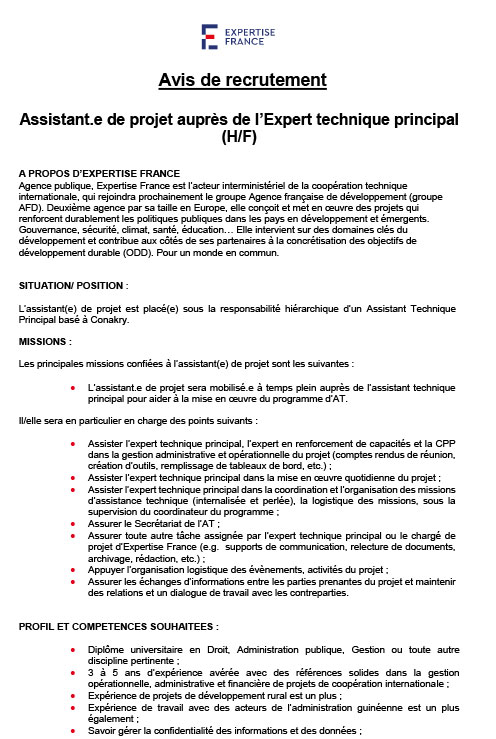 Opportunités d'emplois AVIS DE RECRUTEMENT ASSISTANT.E DE PROJET AUPRES DE L’EXPERTISE TECHNIQUE PRINCIPAL (H/F) Par Sékou Mohamed SAVANE - 21 juillet 2021 0 316 FacebookTwitterPinterestWhatsApp