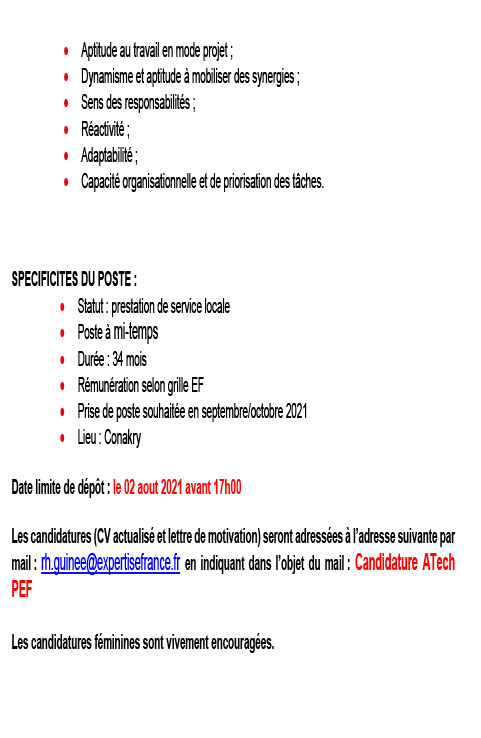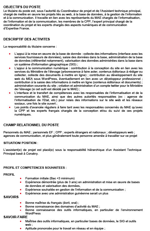Opportunités d'emplois AVIS DE RECRUTEMENT ASSISTANT.E TECHNIQUE NATIONAL.E CHARGE.E DE MISSION NUMERIQUE ET COMMUNICATION POUR LE PROJET PEFFAG (H/F) Par Sékou Mohamed SAVANE - 21 juillet 2021 0 448 FacebookTwitterPinterestWhatsApp