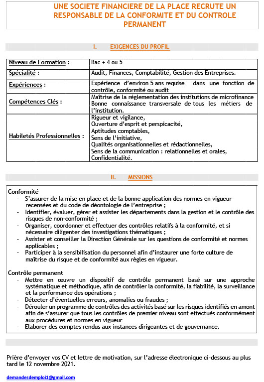 Opportunités d'emplois Une Société Financière de la place recrute un Responsable de la Conformité et du Contrôle Permanent Par Sékou Mohamed SAVANE - 26 octobre 2021 0 2171 FacebookTwitterPinterestWhatsApp