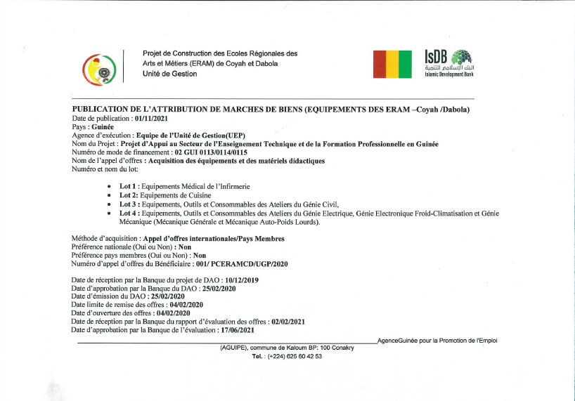 Appels d'offres PUBLICATION D’ATTRIBUTION DE MARCHÃS DE BIENS (EQUIPEMENTS DES ERAM – COYAH/DABOLA) Par Sékou Mohamed SAVANE - 4 novembre 2021 0 1528 FacebookTwitterPinterestWhatsApp TELECHARGEZ LE PDF COMPLET ICIÂ