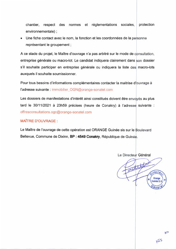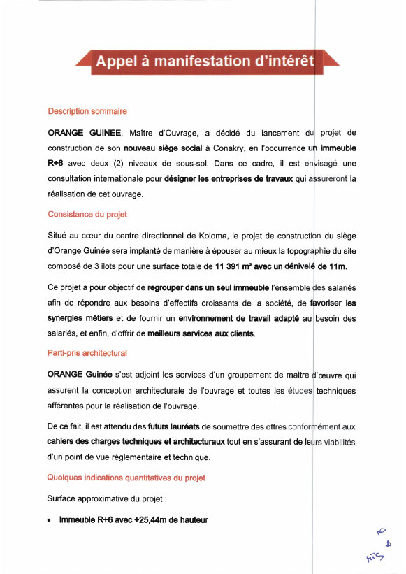 Appels d'offres Avis dâappel à manifestation dâintérêt dâOrange-Guinée pour la construction de son siège Par Sékou Mohamed SAVANE - 5 novembre 2021 0 567 FacebookTwitterPinterestWhatsApp
