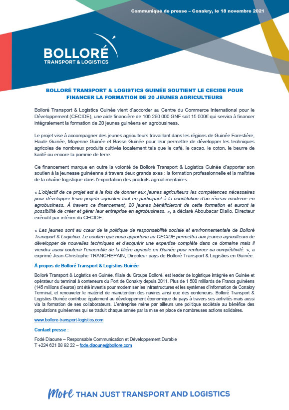 communiques Bolloré Transport & Logistics Guinée souient le CECIDE pour financier la formation de 20 jeunes agriculteurs (Communiqué) Par Sékou Mohamed SAVANE - 18 novembre 2021 0 5451 FacebookTwitterPinterestWhatsApp