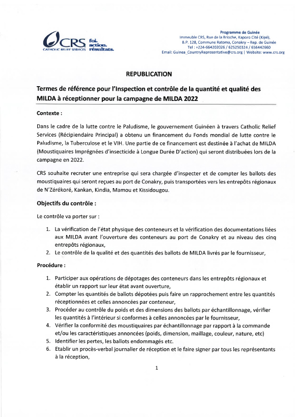 Appels d'offres Republication des TDR pour lâinspection et contrôle de la quantité et qualité des MILDA 2022 Par Sékou Mohamed SAVANE - 10 janvier 2022 0 460 FacebookTwitterPinterestWhatsApp