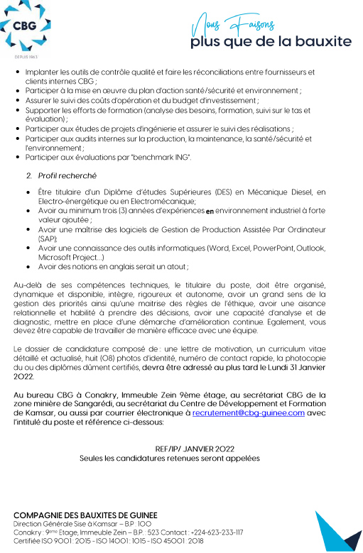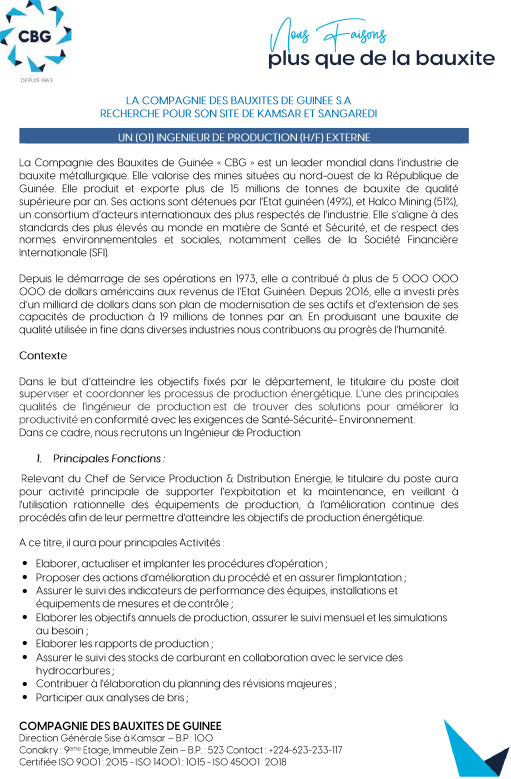 Opportunités d'emplois La CBG recherche un ingénieur de production externe (H/F) pour son site de Kamsar et Sangaredi Par Sékou Mohamed SAVANE - 17 janvier 2022 0 949 FacebookTwitterPinterestWhatsApp