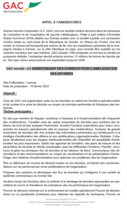Opportunités d'emplois GAC recrute (1) Surintendant des données pour lâamélioration des affaires Par Sékou Mohamed SAVANE - 16 février 2022 0 286 FacebookTwitterPinterestWhatsApp