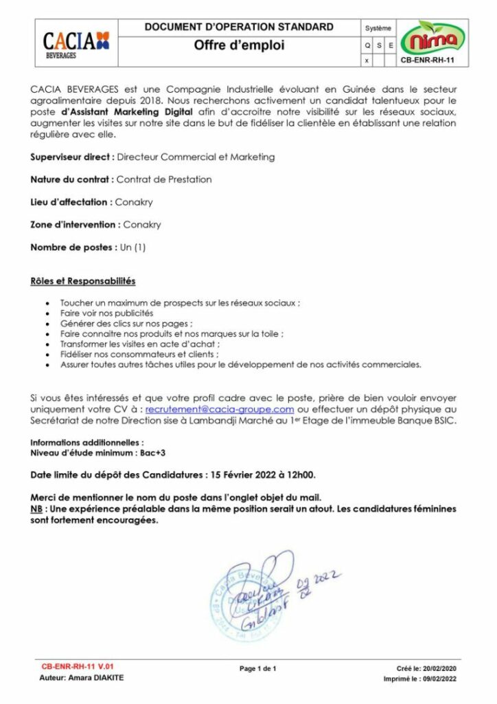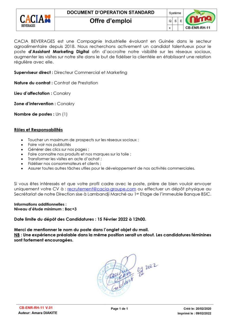 Opportunités d'emplois La société CACIA BEVERAGES est à la recherche de son Assistant (e) Marketing digital Par Sékou Mohamed SAVANE - 21 février 2022 0 18991 FacebookTwitterPinterestWhatsApp