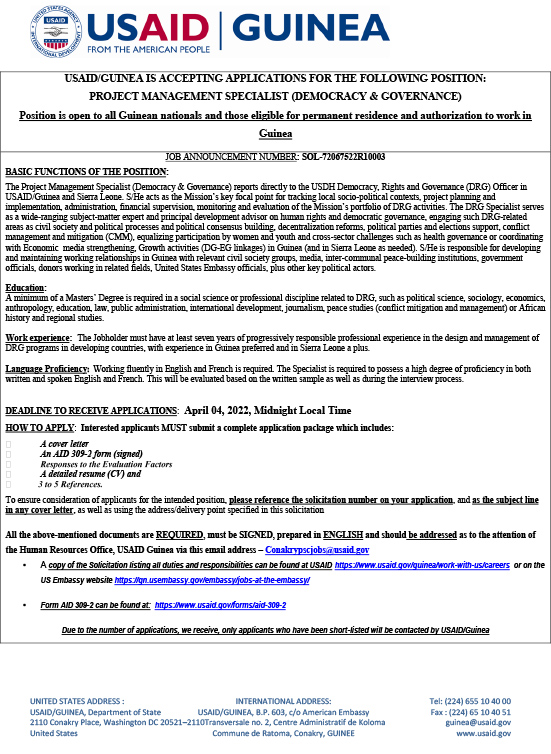 Opportunités d'emplois USAID RECRUTE PROJECT MANAGEMENT SPECIALIST (DEMOCRACY & GOVERNANCE) Par Sékou Mohamed SAVANE - 3 mars 2022 0 867 FacebookTwitterPinterestWhatsApp