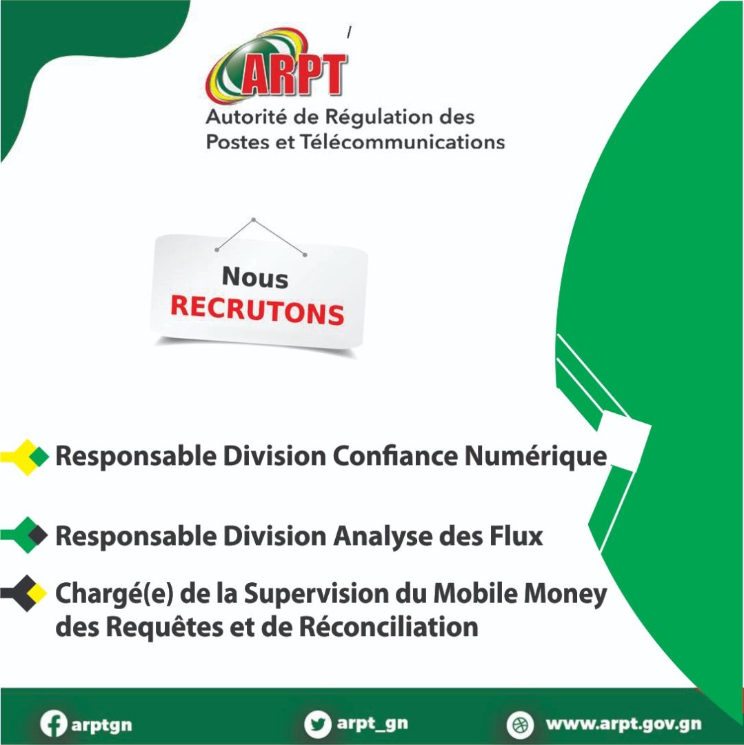 Opportunités d'emplois L’ARPT RECRUTE UN RESPONSABLE…. Par Sékou Mohamed SAVANE - 28 mars 2022 0 380 FacebookTwitterPinterestWhatsApp