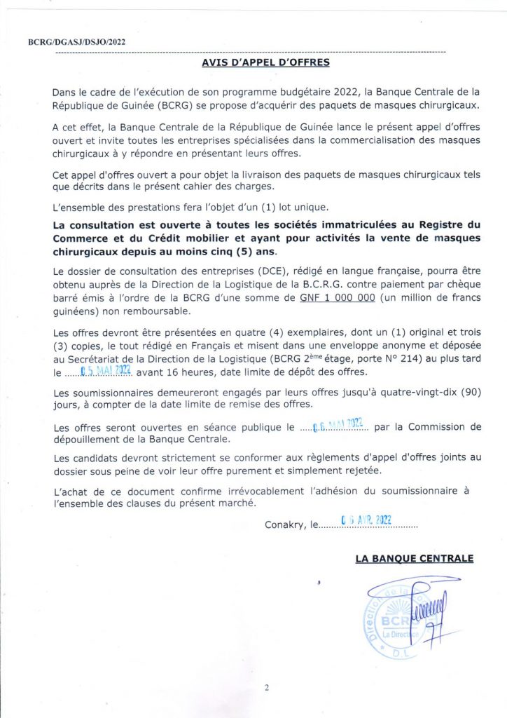 Appels d'offres La BCRG lance un Appel dâoffres pour lâacquisition des paquets de masques chirurgicaux Par Sékou Mohamed SAVANE - 6 avril 2022 0 455 FacebookTwitterPinterestWhatsApp