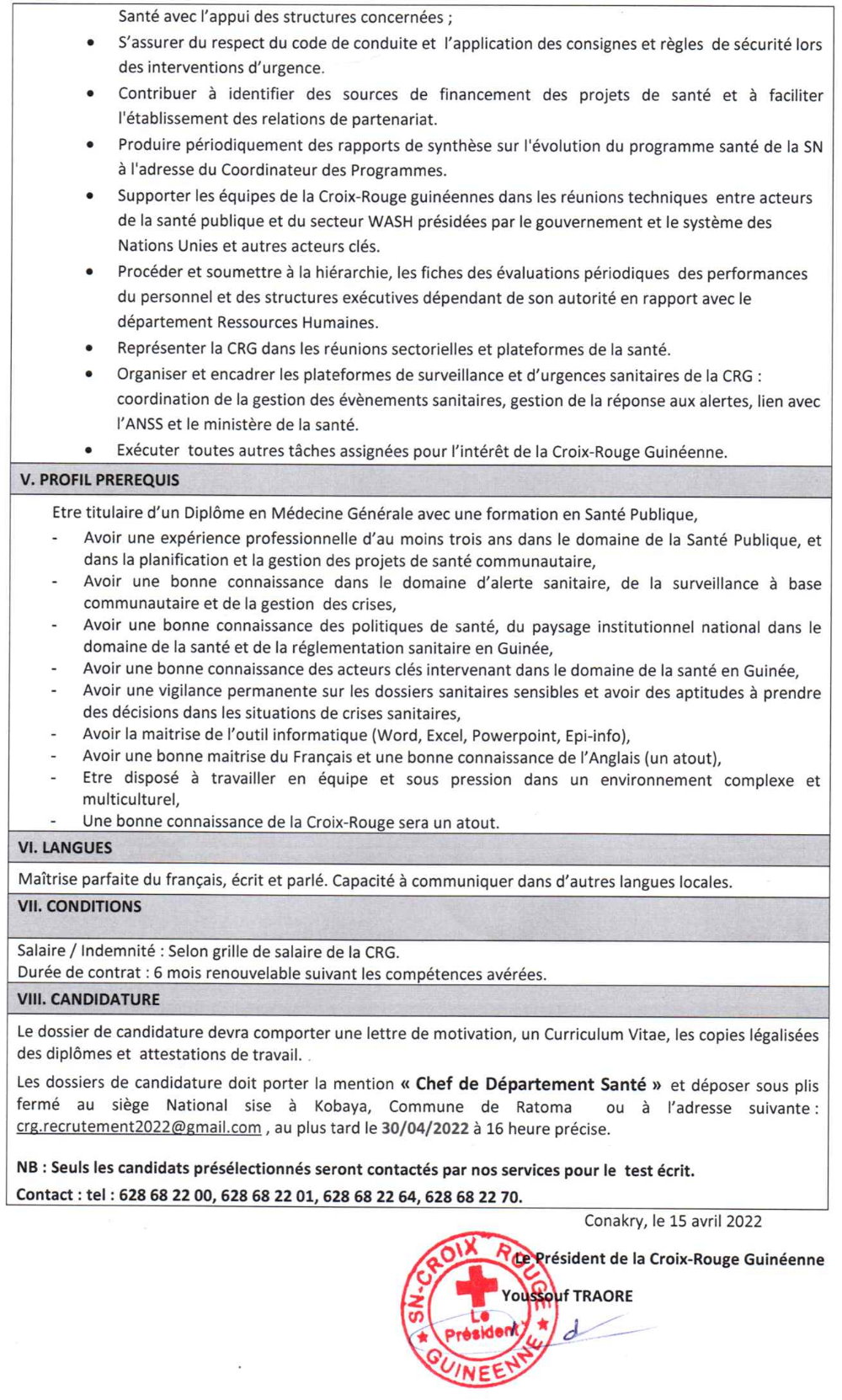 Opportunités d'emplois Avis de recrutement d’un Chef de Département Santé et Soins Communautaires Conakry, Guinée Par Sékou Mohamed SAVANE - 19 avril 2022 0 315 FacebookTwitterPinterestWhatsApp
