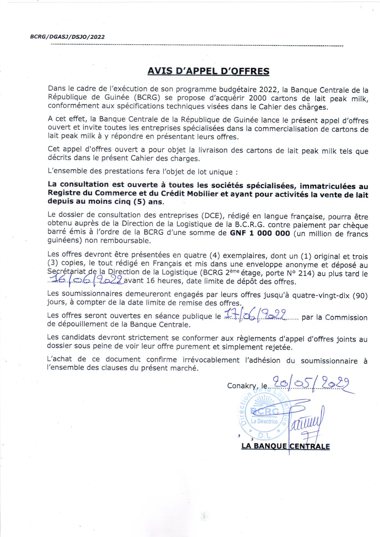 Appels d'offres AVIS D’APPEL D’OFFRES POUR LA FOURNITURE DE LAIT PEAK MILK Par Sékou Mohamed SAVANE - 26 mai 2022 0 228 FacebookTwitterPinterestWhatsApp