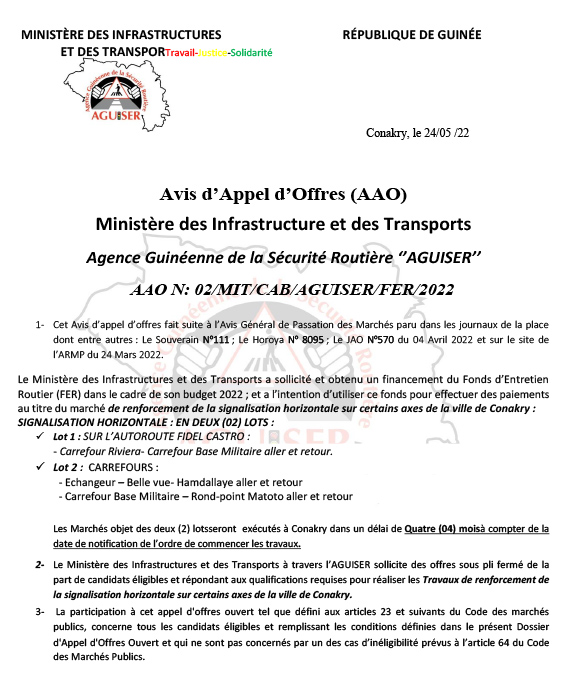Appels d'offres Appel d’offres AAO N: 02/MIT/CAB/AGUISER/FER/2022 pour le renforcement de la signalisation horizontale sur certains axes de la ville de Conakry Par Sékou Mohamed SAVANE - 26 mai 2022 0 334 FacebookTwitterPinterestWhatsApp