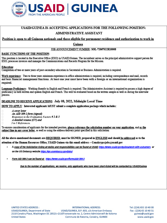 Opportunités d'emplois RECRUTEMENT ADMINISTRATIVE ASSISTANT Par Sékou Mohamed SAVANE - 8 juin 2022 0 203 FacebookTwitterPinterestWhatsApp