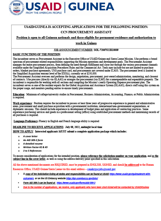 Opportunités d'emplois AVIS DE RECRUTEMENT PROCUREMENT ASSISTANT Par Sékou Mohamed SAVANE - 8 juin 2022 0 453 FacebookTwitterPinterestWhatsApp