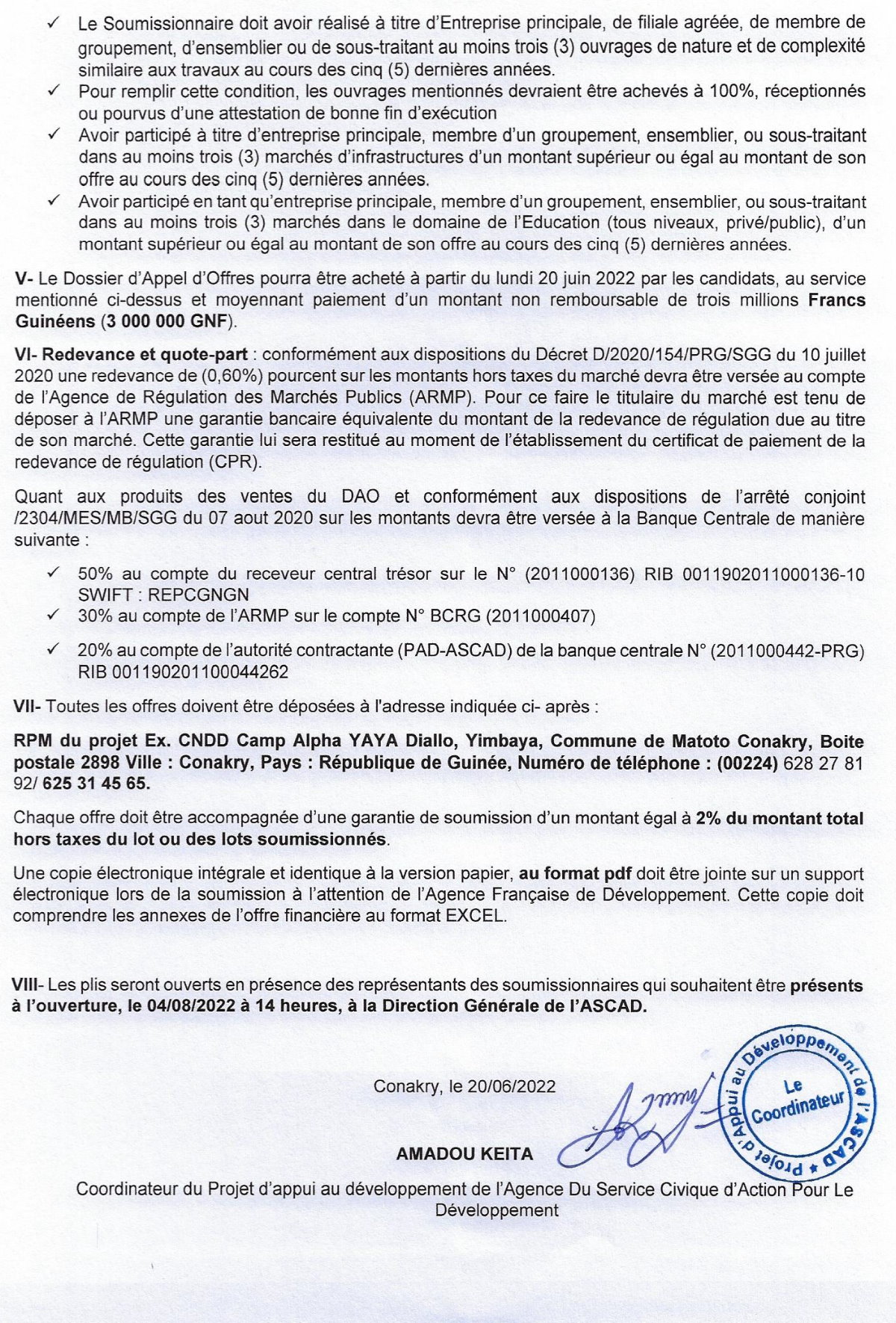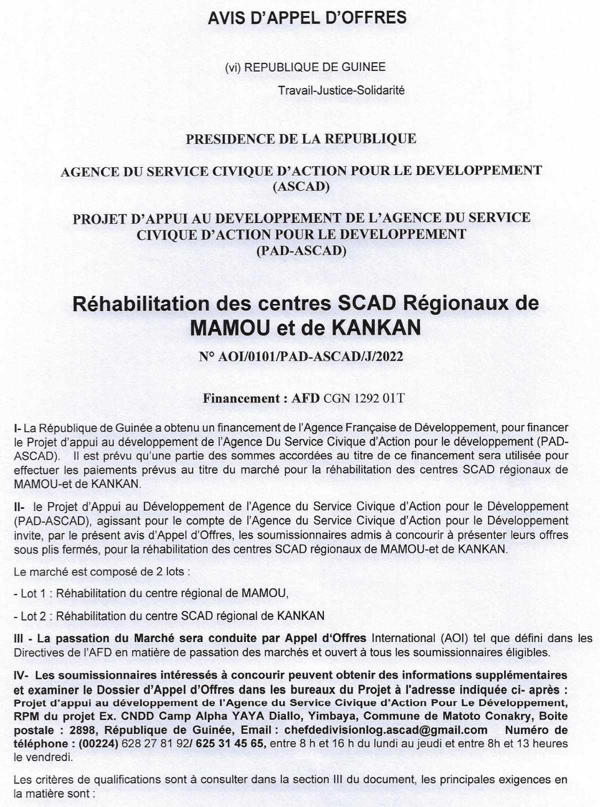 Appels d'offres Avis d’appel d’offres pour la Réhabilitation des centres SCAD Régionaux de MAMOU et de KANKAN Par Sékou Mohamed SAVANE - 20 juin 2022 0 405 FacebookTwitterPinterestWhatsApp