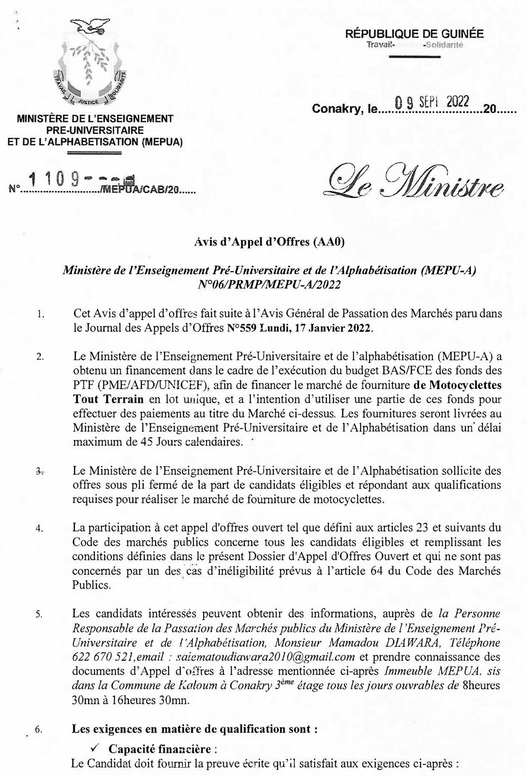 Appels d'offres Avis d’appel d’offres pour le marché de fourniture de Motocyclettes Tout Terrain en lot unique Par Sékou Mohamed SAVANE - 12 septembre 2022 0 193 FacebookTwitterPinterestWhatsApp