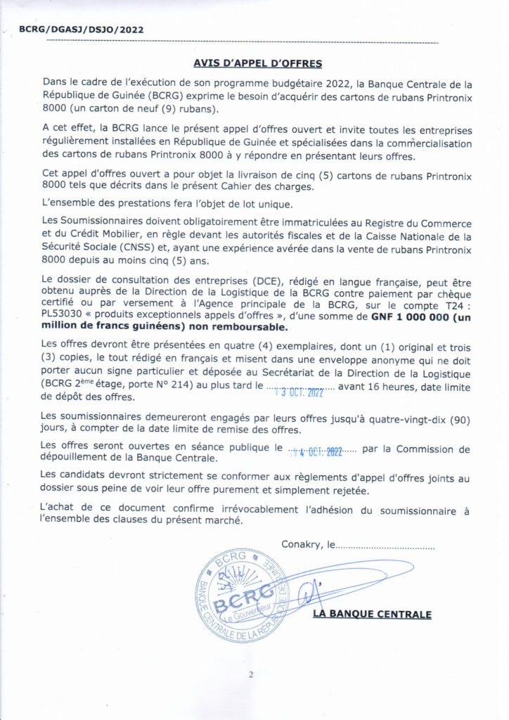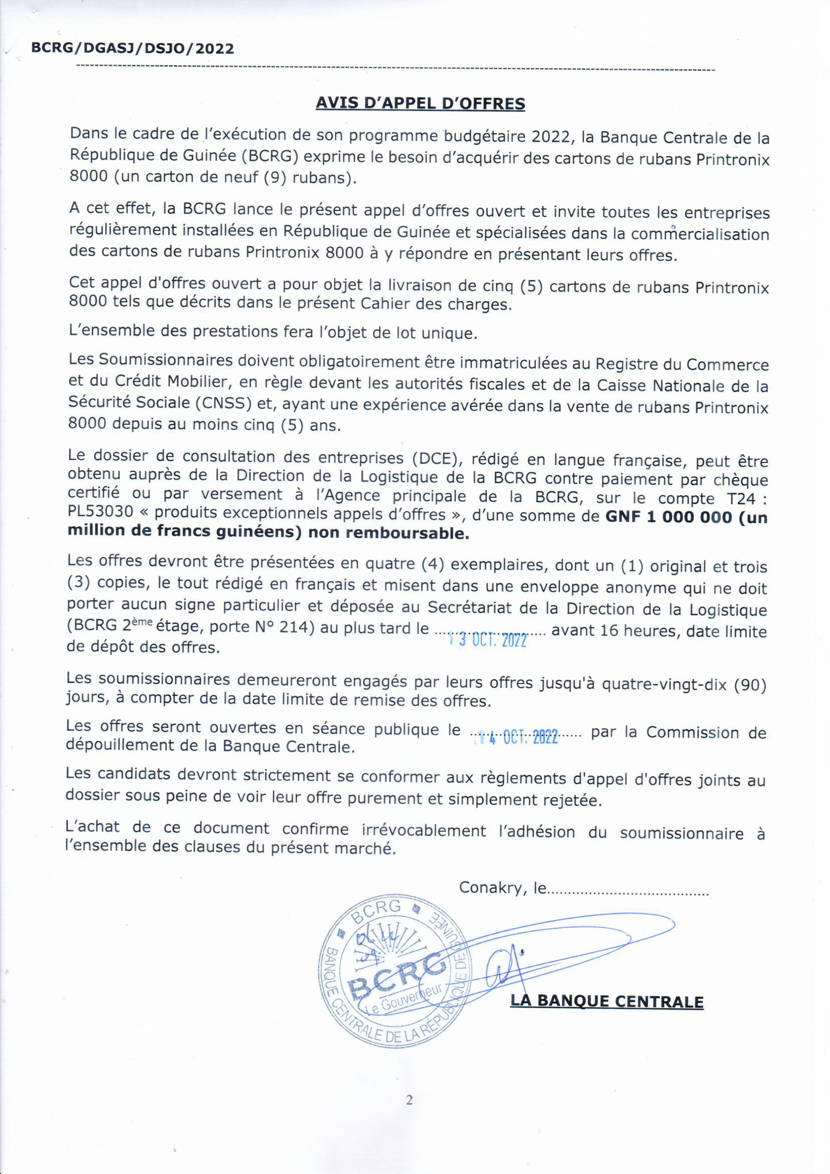 Appels d'offres AVIS D’APPEL D’OFFRES: ACHAT DES CARTONS DE RUBANS PRINTRONIX….. Par Sékou Mohamed SAVANE - 16 septembre 2022 0 219 FacebookTwitterPinterestWhatsApp