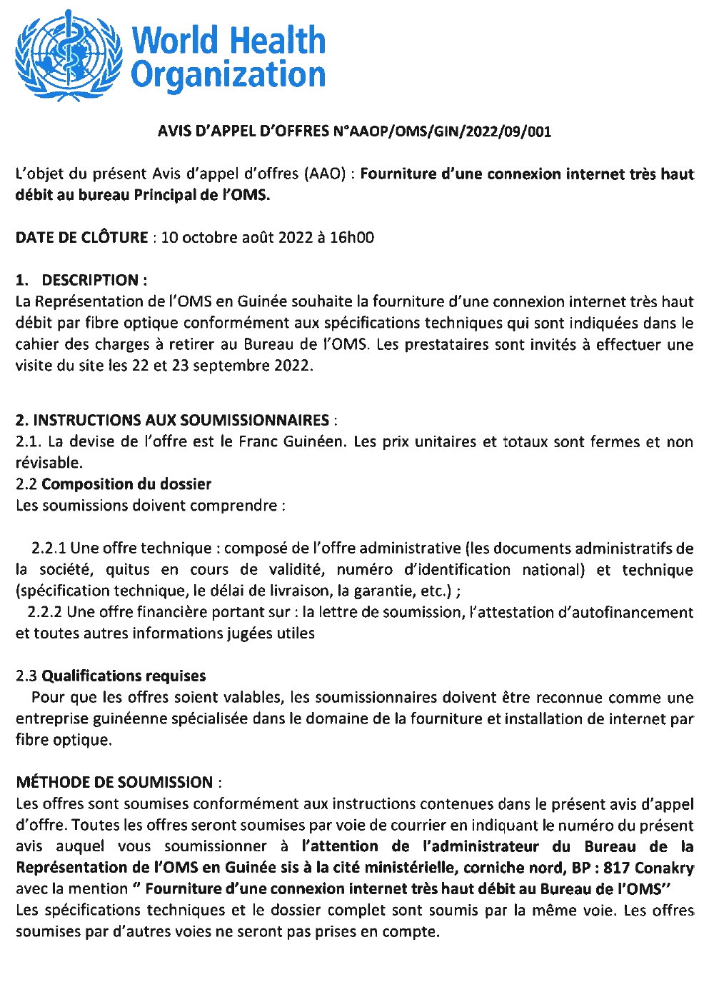 Appels d'offres Avis d’appel d’offres pour la Fourniture d’une connexion internet très haut débit au bureau Principal de l’OMS. Par Sékou Mohamed SAVANE - 19 septembre 2022 0 280 FacebookTwitterPinterestWhatsApp