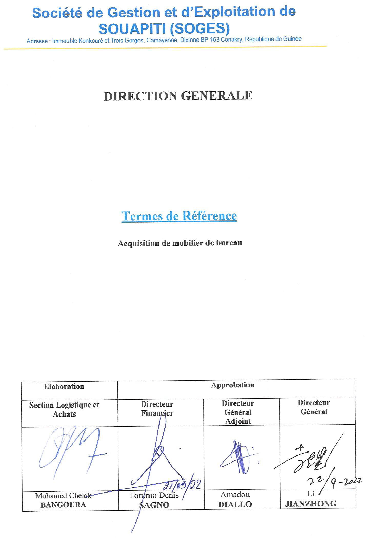 La Guinée a saisi l’opportunité historique de réalisation de l’Aménagement Hydroélectrique de Souapiti, Cette opportunité s’est appuyée sur le succès majeur du Projet Kaléta. Après la phase de construction, une nouvelle équipe a été mise en place pour la phase d’exploitation qui a commencé depuis le 1er janvier 2021. Conformément aux recommandations du Conseil d’Administration, la SOGES a décidé de s’équiper en matériel informatique et mobilier de bureau pour son fonctionnement.