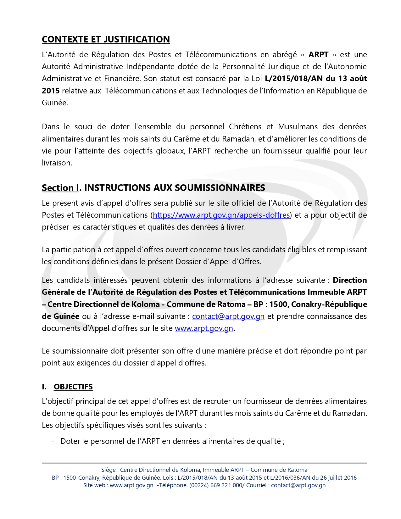 Appels d'offres AVIS D’APPEL D’OFFRES POUR LA FOURNITURE DE DENREES ALIMENTAIRES POUR LES MOIS SAINTS DU CAREME ET DU RAMADAN Par Sékou Mohamed SAVANE - 16 décembre 2022 0 178 FacebookTwitterPinterestWhatsApp Télécharger l’avis complet en PDF