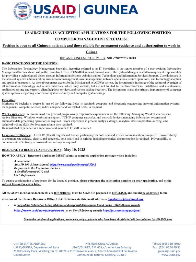 Opportunités d'emplois Avis de recrutement COMPUTER MANAGEMENT SPECIALIST Par Sékou Mohamed SAVANE - 11 avril 2023 0 141 FacebookTwitterPinterestWhatsApp