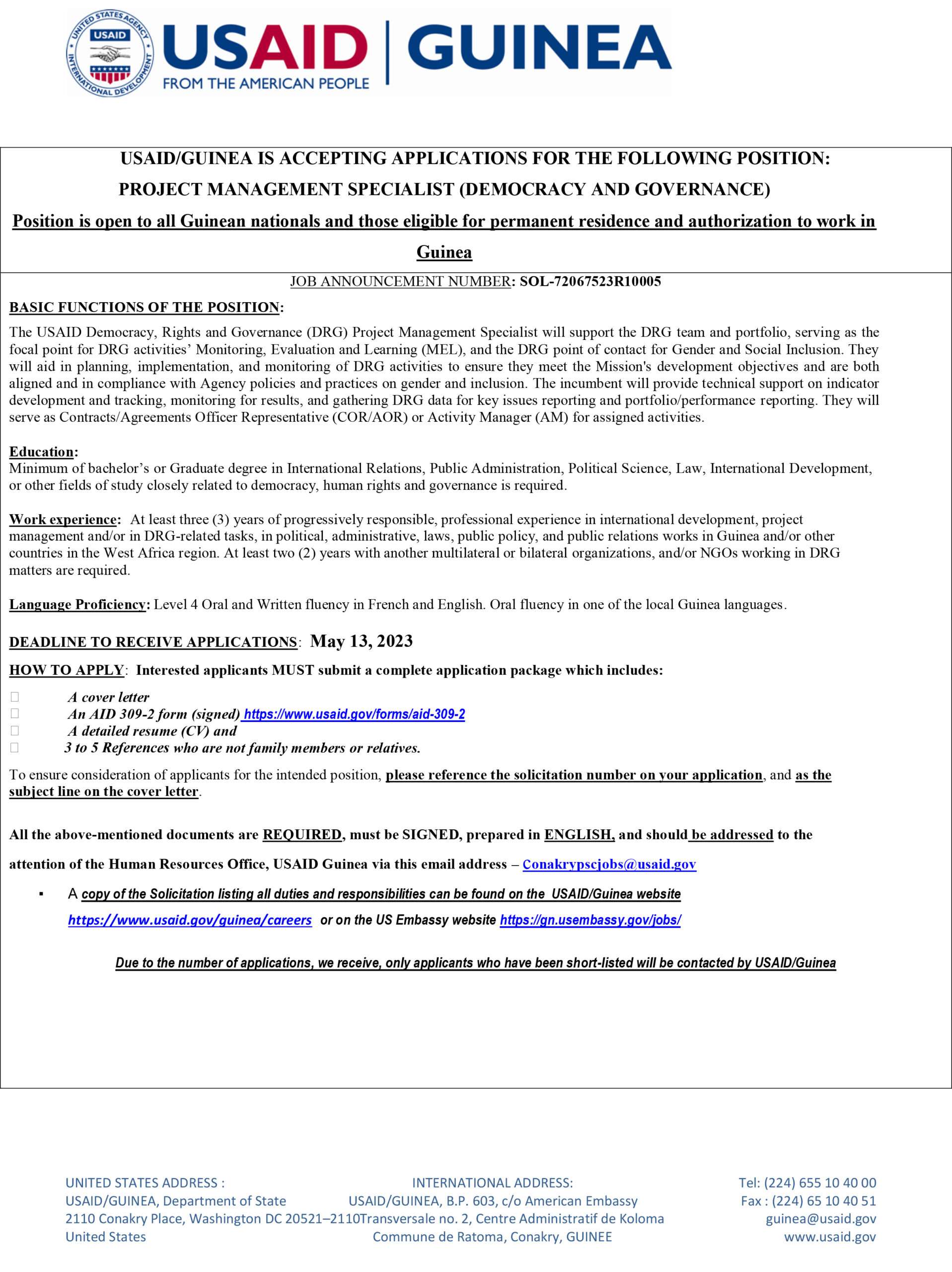 Opportunités d'emplois AVIS DE RECRUTEMENT PROJECT MANAGEMENT SPECIALIST (DEMOCRACY AND GOVERNANCE) Par Sékou Mohamed SAVANE - 12 avril 2023 0 168 FacebookTwitterPinterestWhatsApp